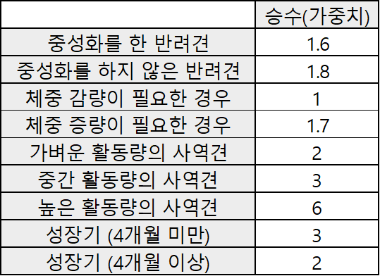 기본 계산법 (일반 사료 기준, 처방사료도 유사)
