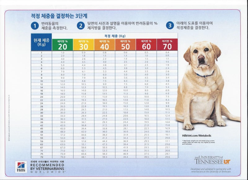 - 사료 100g당 칼로리를 확인 후 급여량 환산 (대부분 처방사료는 300~400kcal/100g)